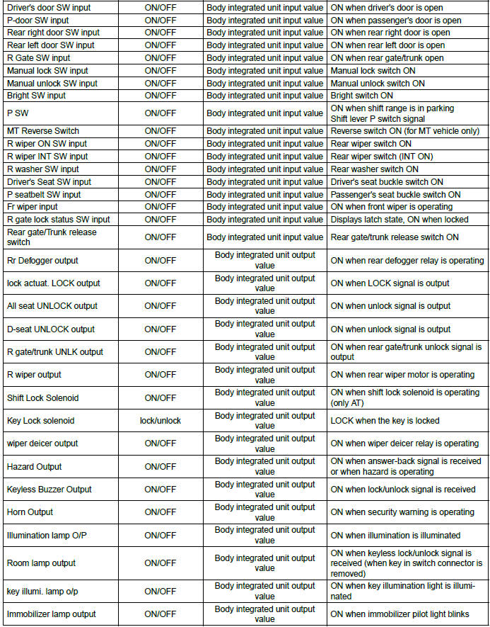 NOTE: In order to check the body integrated unit function, inspect the body integrated unit and actuator using Subaru Select Monitor without operating switches.