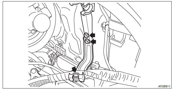 11) Remove the bolt and disconnect the engine harness connector.