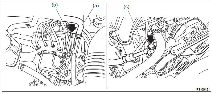 - Remove the bolt, and disconnect the hose (c) from the power steering