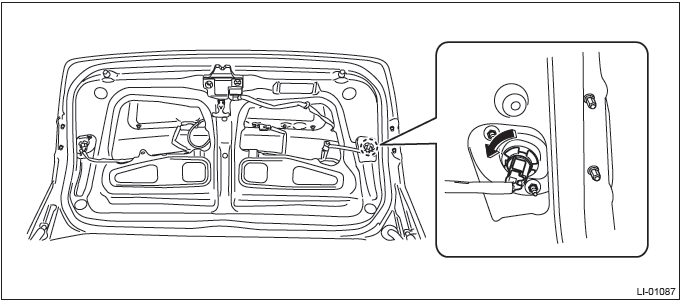 2) Remove the trunk lid trim. <Ref. to EI-127, TRUNK LID TRIM, REMOVAL, Trunk Room Trim.>